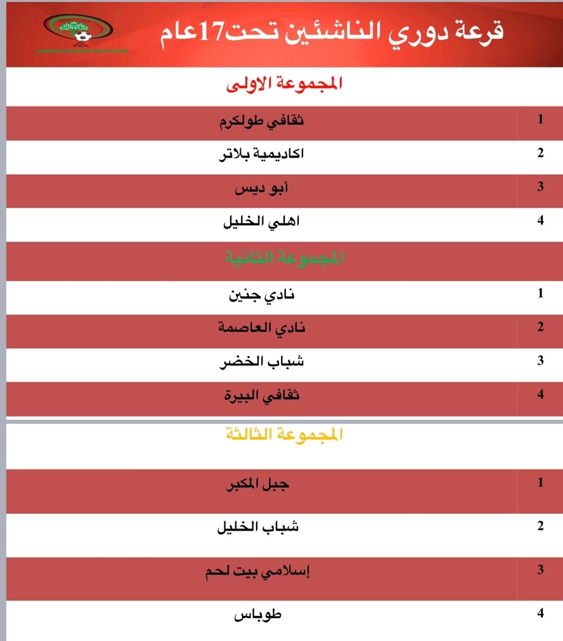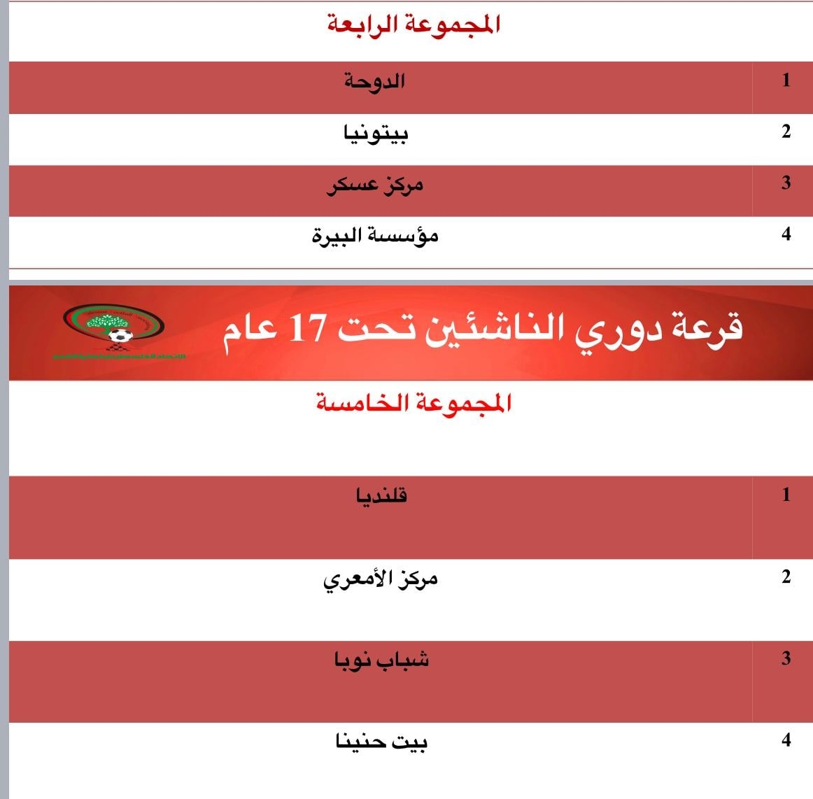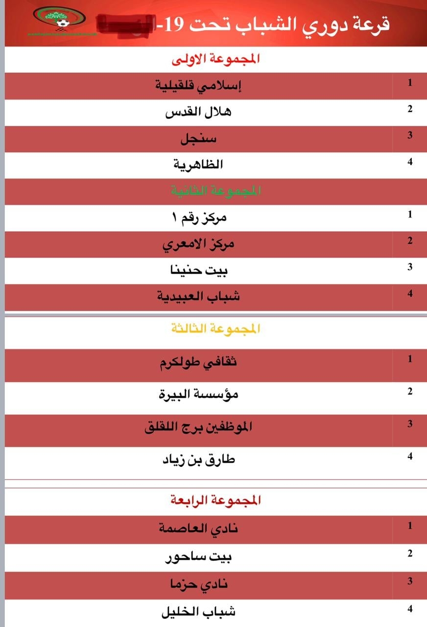 القدس- دائرة الاعلام بالاتحاد- سحب الاتحاد الفلسطيني لكرة القدم اليوم اللإثنين، في مقر اللأكاديمية الوطنية الفلسطينية للرياضة "بلاتر" في البيرة، قرعة الدوري المركزي للشباب تحت ١٩ عاما ودوري الناشئين تحت ١٧عاما، وذلك بحضور رئيس دائرة المسابقات علي جبريل، ومسؤول دائرة الشباب لإسلام مشارقة وعدد من موظفي الاتحاد وممثلي الأندية.
