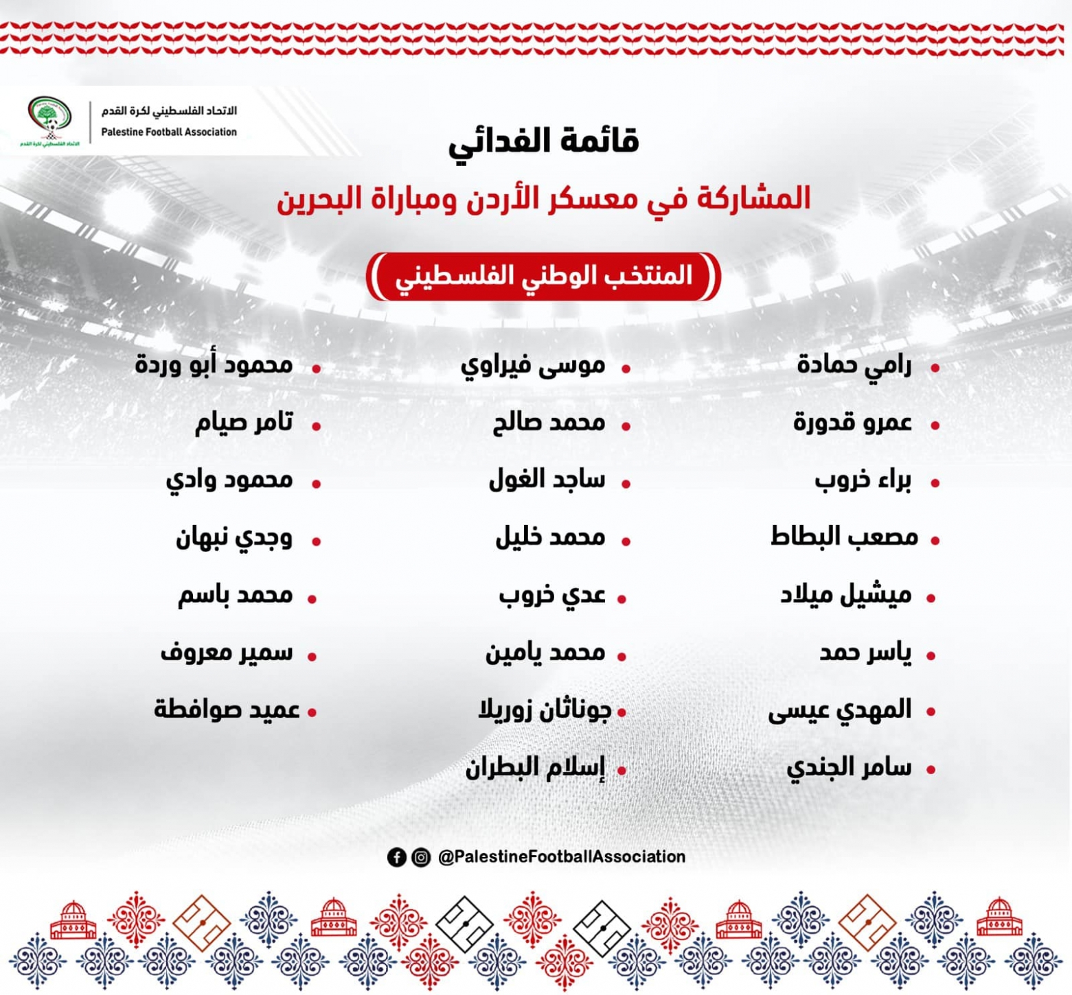 وضمت قائمة الفدائي ٢٣ لاعباً لمواجهة البحرين ، حيث انضم للمعسكر الحالي كل من :