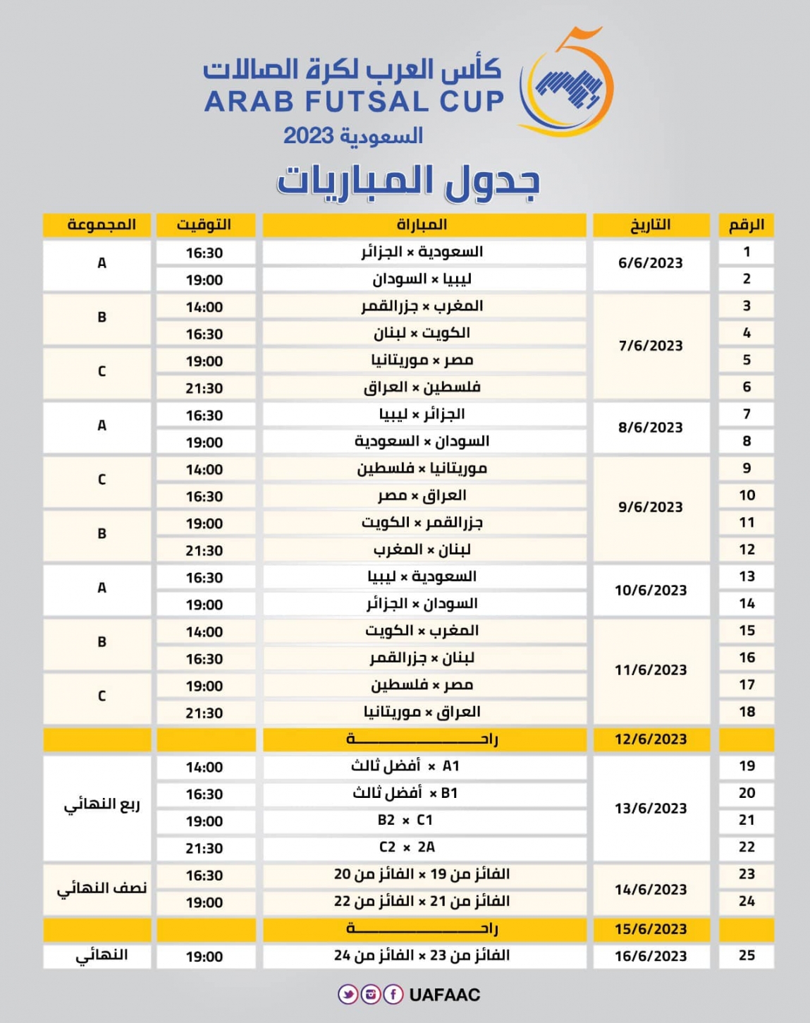بدأ المنتخب الوطني لكرة الصالات استعداداته للمشاركة في بطولة كأس العرب 2023 التي ستقام في مدينة جدة السعودية خلال الفترة من 6 حتى 16 يونيو/ حزيران المقبل.