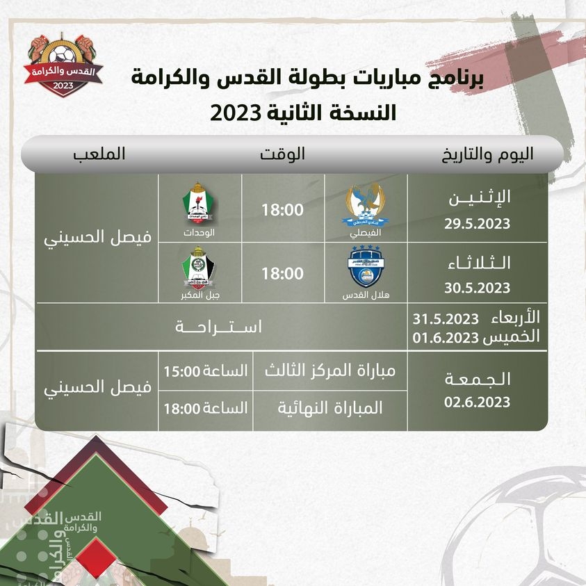 أعلنت اللجنة المنظمة لبطولة القدس والكرامة بنسختها الثانية، عن جدول مباريات البطولة والتي ستنطلق يوم الاثنين الموافق 29.05.2023 على استاد الشهيد فيصل الحسيني في القدس.