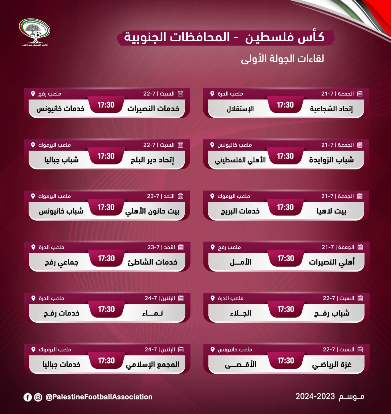 تنطلق الجمعة منافسات دور الـ32 من كأس فلسطين لأندية المحافظات الجنوبية "بطولة المرحوم إبراهيم أبو سليم" بمشاركة 28 نادياً، بعد توقف البطولة في المواسم الثلاثة الماضية.