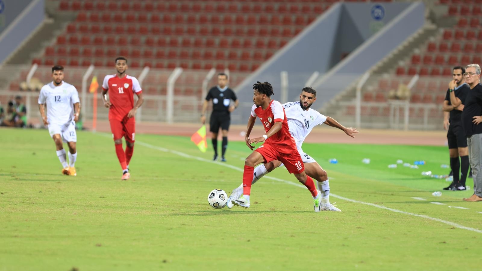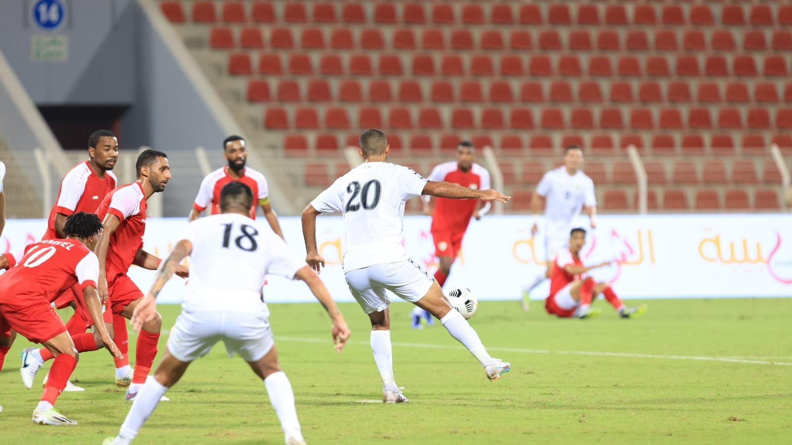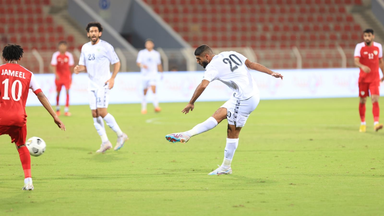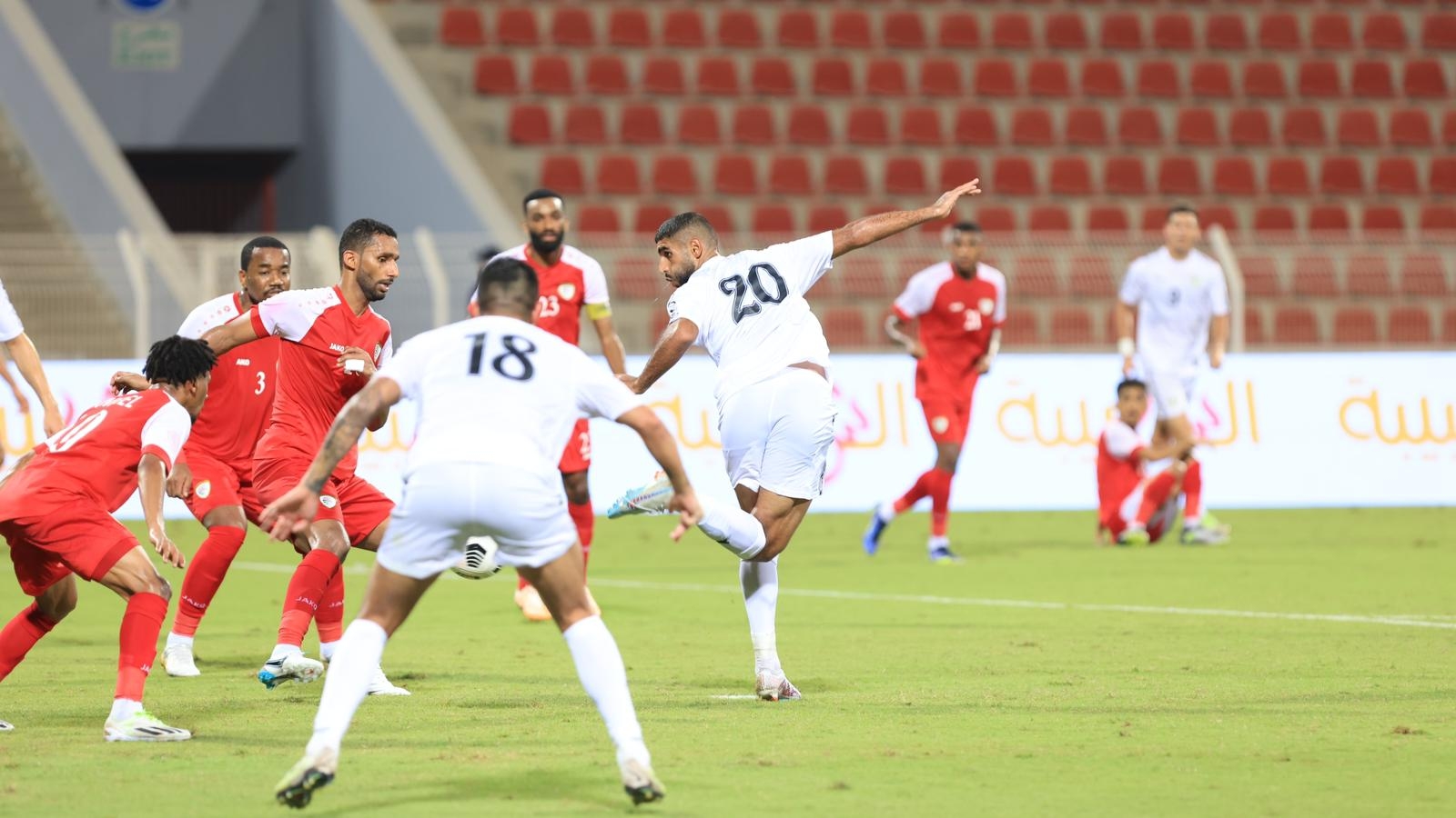 مع مرور الوقت، بدأ المنتخب العماني يستحوذ على الكرة، وسط تراجع لمنتخبنا إلى الدفاع. وشن العمانيون هجمات عبر الأطراف، أسفرت إحداها عن هدف التعادل برأسية عمر المالكي في الدقيقة 20.