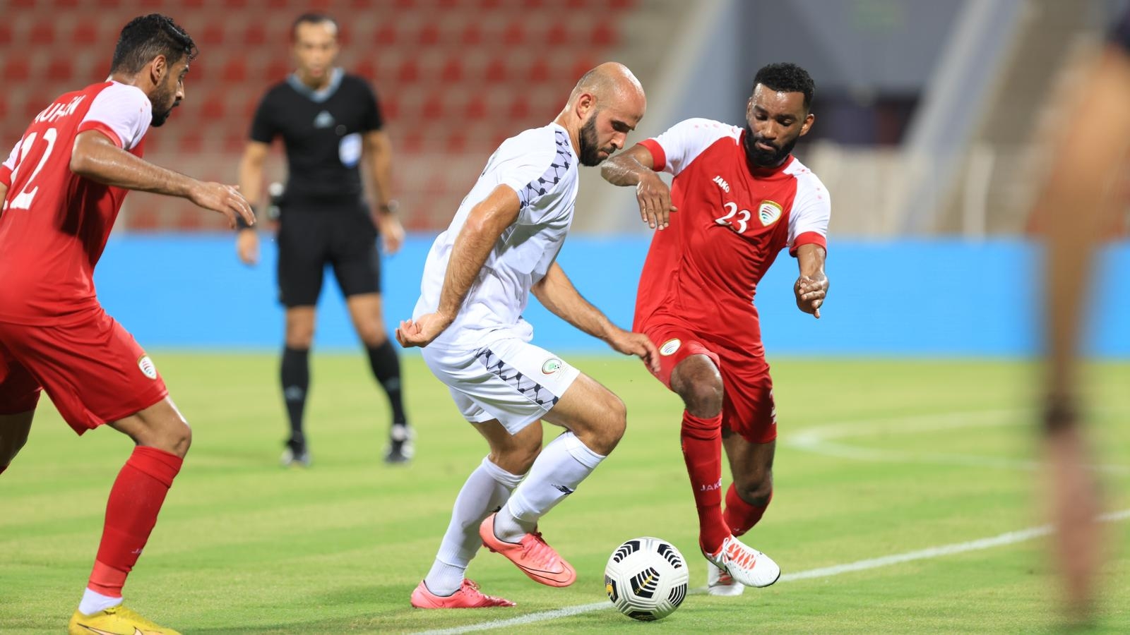 وفي الدقيقة الثانية من الوقت بدل الضائع، تصدى رامي حمادة لانفراد من عبد الرحمن المشيفري وأبعد الكرة إلى ركنية، لينتهي الشوط الأول بتقدم عمان بهدفين لهدف.