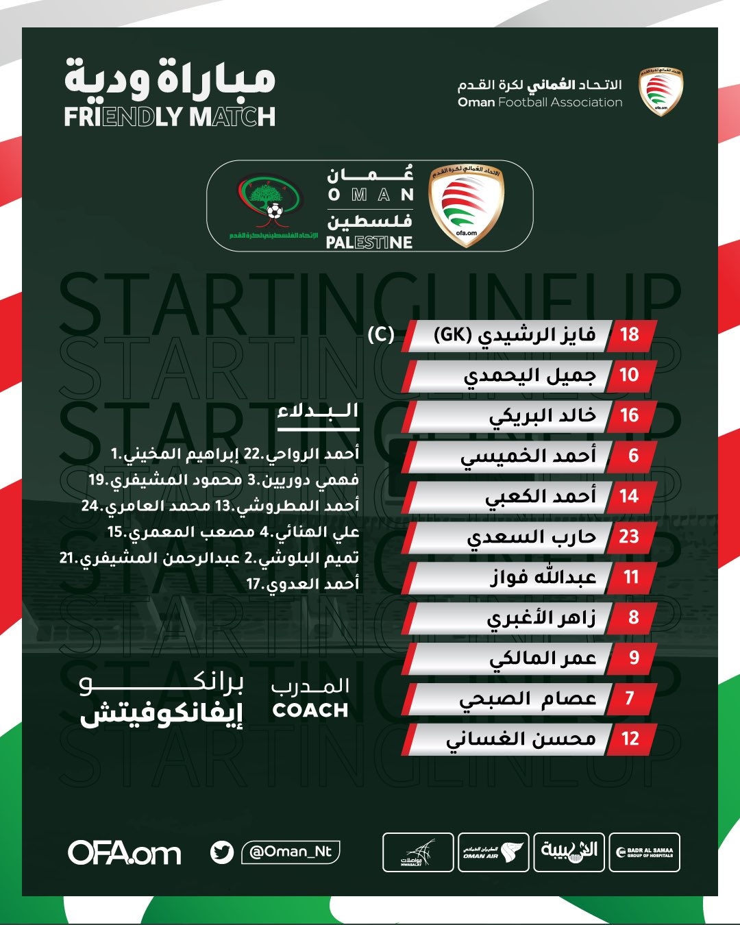 على غرار أبو وردة، تعرض المالكي للإصابة، ولم يتمكن من إكمال المباراة، ليدخل مكانه عبد الرحمن المشيفري الذي أهدر هدف التقدم لبلاده عند الدقيقة 32، بعدما لعب الكرة عالية فوق الحارس رامي حمادة الذي خرج من مرماه، ولكن الكرة جانبت القائم بقليل.