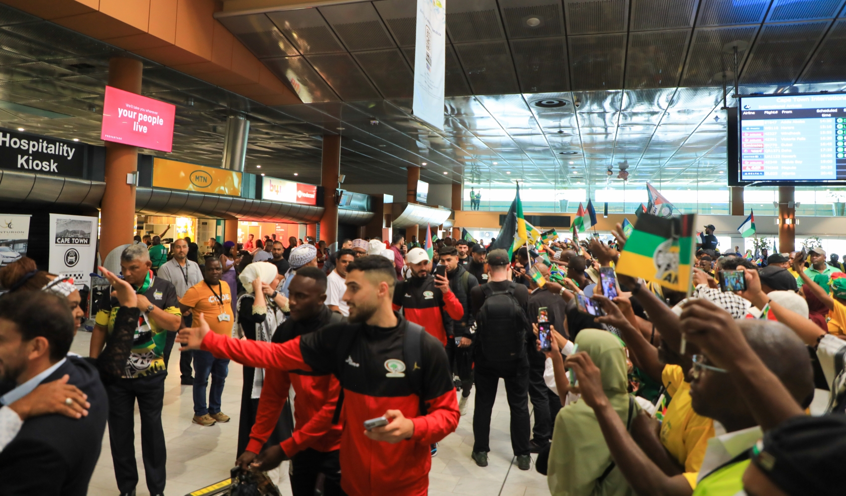 وكان في استقبال البعثة لدى وصولها إلى مطار كيب تاون حشد غفير من الجنوب أفريقيين الذي هتفوا بالحرية لفلسطين وغزة، ولوّحوا بالأعلام الفلسطينية والجنوب أفريقية.