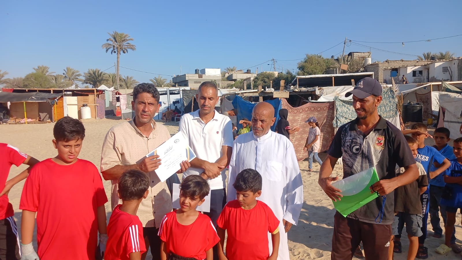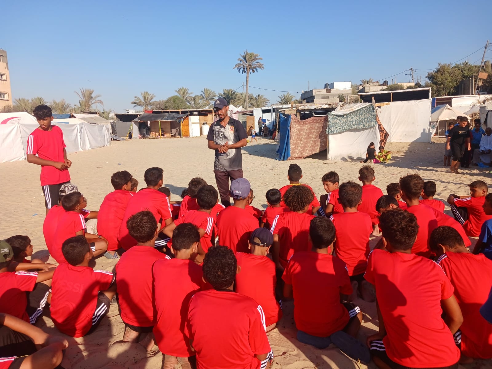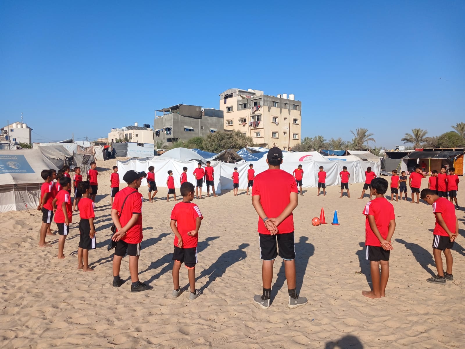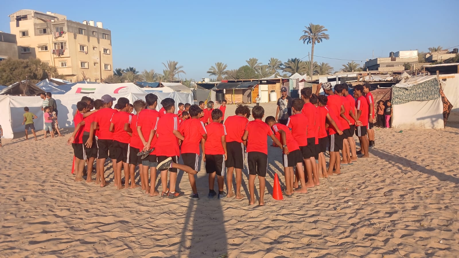 الاتحاد الفلسطيني لكرة القدم، عمل على تحدي الظروف المأساوية، وبدأ العمل على إحياء النشاط الرياضي والكروي بعد توقفه منذ بدء العدوان، عبر إطلاق مبادرة تدريب كرة القدم للأطفال النازحين في مواصي خان يونس.