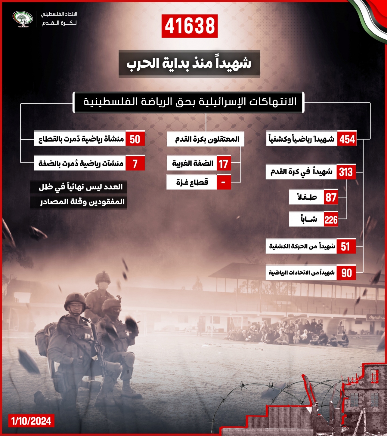 وبلغ عدد شهداء الحركة الرياضية والكشفية الفلسطينية جراء العدوان الإسرائيلي المتواصل منذ 7 أكتوبر الماضي، 454 شهيدا، منهم 313 في كرة القدم (87 طفلا، 226 شابا) إضافة إلى 90 شهيدا من الاتحادات الرياضية الأولمبية، و50 شهيدا من أبناء الحركة الكشفية.