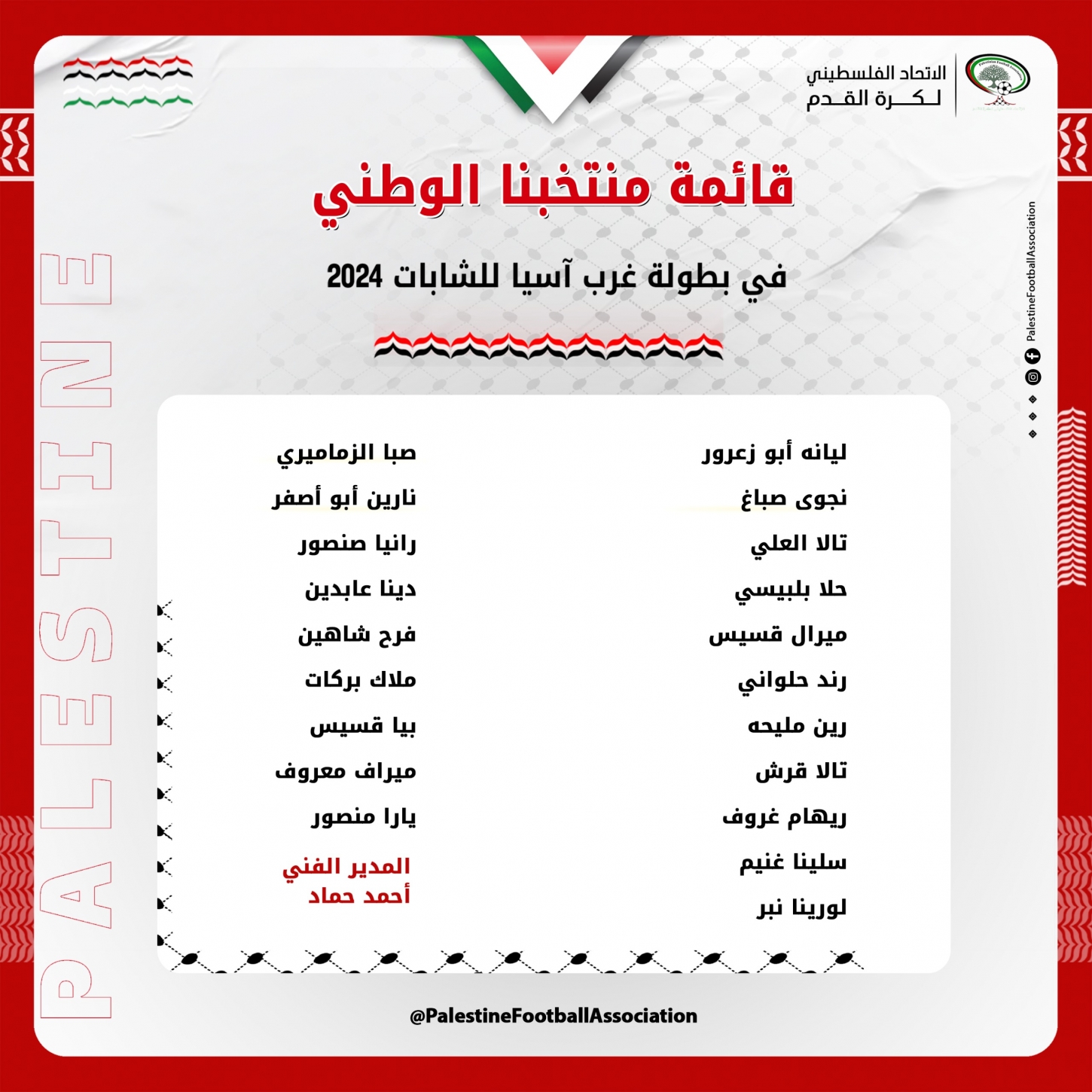 وجاء في القائمة 20 لاعبة، هنّ: ليانه أبو زعرور، نجوى صباغ، تالا العلي، حلا بلبيسي، ميرال قسيس، رند حلواني، رين مليحه، تالا قرش، ريهام غروف، سلينا غنيم، لورينا نبر، صبا الزماميري، نارين أبو أصفر، رانيا صنصور، دينا عابدين، فرح شاهين، ملاك بركات، بيا قسيس، ميراف معروف، يارا منصور.