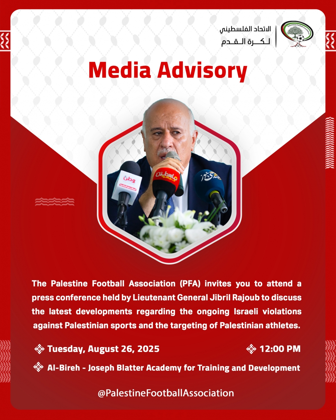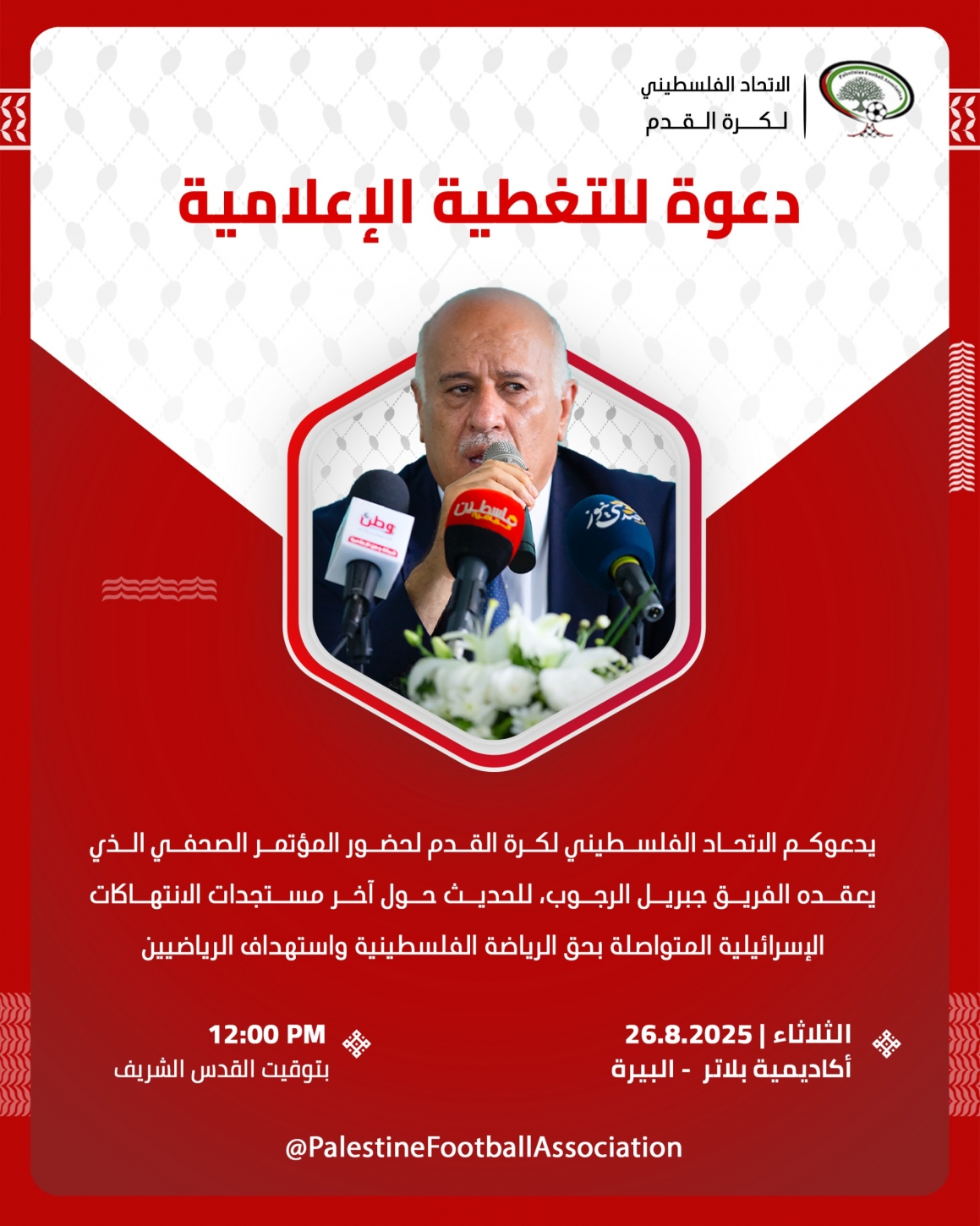 يعقد الفريق جبريل الرجوب، رئيس الاتحاد الفلسطيني لكرة القدم، يوم الثلاثاء (26/8/2025) مؤتمرا صحافيا للحديث حول آخر مستجدات الانتهاكات الإسرائيلية المتواصلة بحق الرياضة الفلسطينية واستهداف الرياضيين.