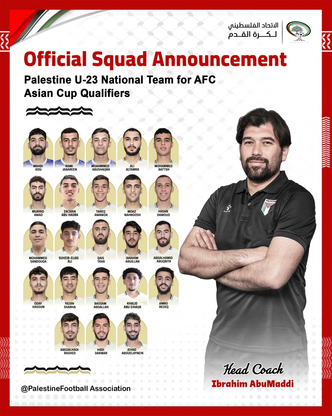 أعلن الجهاز الفني لمنتخبنا الوطني الأولمبي بقيادة المدرب إبراهيم أبو ماضي، عن القائمة النهائية المكوّنة من 23 لاعباً للمشاركة في التصفيات المؤهلة إلى نهائيات كأس آسيا 2026 تحت 23 عاماً.