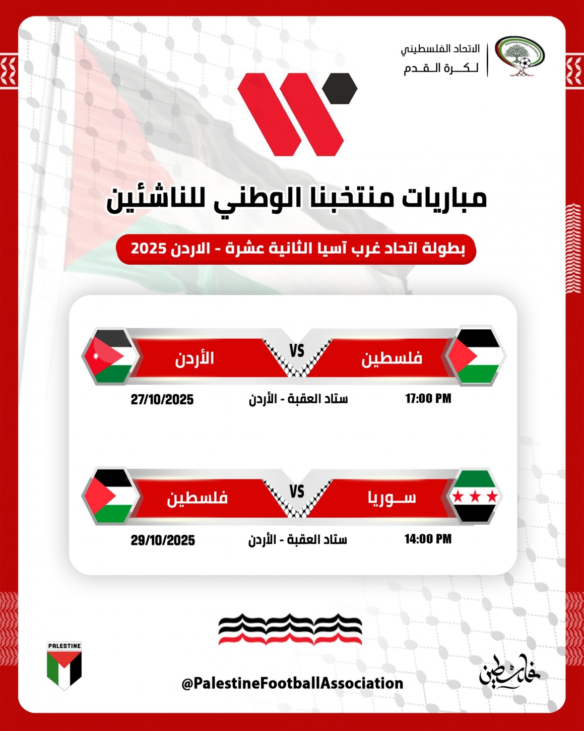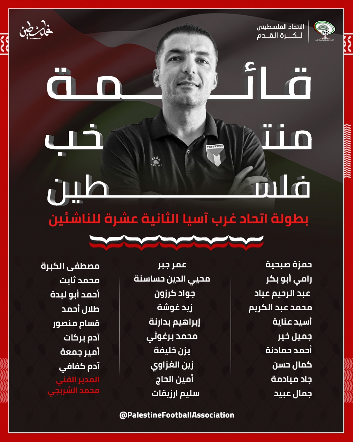 استدعى الجهاز الفني لمنتخبنا الوطني للناشئين، بقيادة المدير الفني محمد الشربجي، قائمة اللاعبين الذين سيمثلون فلسطين في بطولة اتحاد غرب آسيا الثانية عشرة للناشئين، المقررة في مدينة العقبة الأردنية خلال الفترة من 27 تشرين الأول/أكتوبر وحتى 4 تشرين الثاني/نوفمبر 2025.