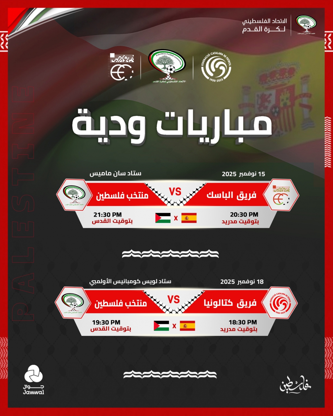 ويواجه الفدائي فريق الباسك في 15 نوفمبر الجاري عند الساعة التاسعة والنصف مساءً بتوقيت القدس، على ملعب سان ماميس بمدينة بلباو. فيما يلتقي فريق كاتالونيا في 18 نوفمبر عند الساعة السابعة والنصف مساءً على ملعب لويس كومبانيس الأولمبي في برشلونة.