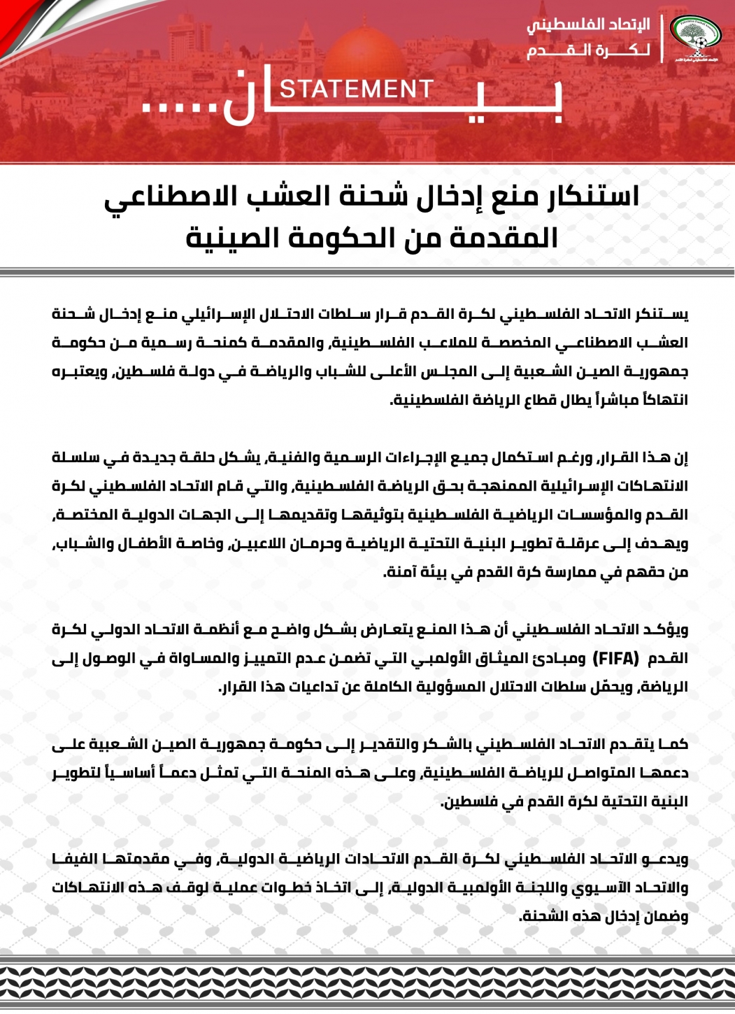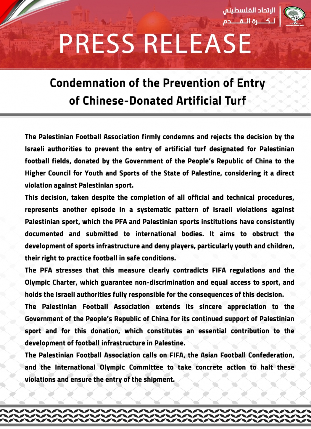 The Palestinian Football Association firmly condemns and rejects the decision by the Israeli authorities to prevent the entry of artificial turf designated for Palestinian football fields, donated by the Government of the People’s Republic of China to the Higher Council for Youth and Sports of the State of Palestine, considering it a direct violation against Palestinian sport.